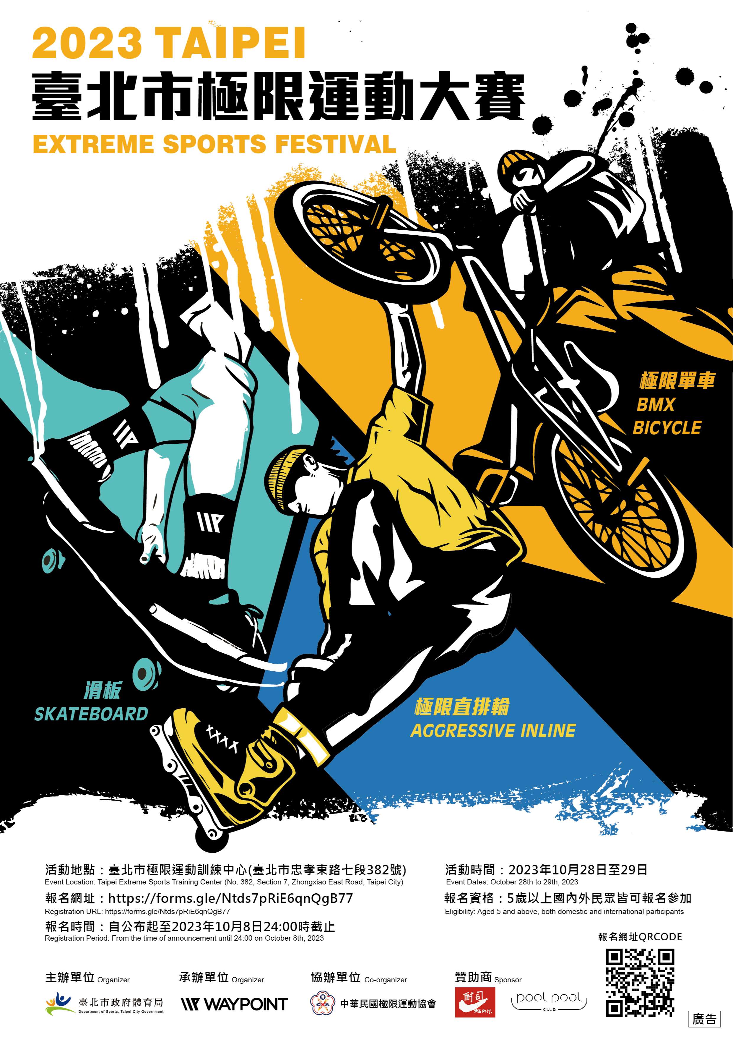 活動由本局主辦,威整合運動股份有限公司承辦,訂 於112年10月28日至29日(星期六、日)假臺北市極限運動訓 練中心舉辦,自即日起至10月8日24時開放報名。