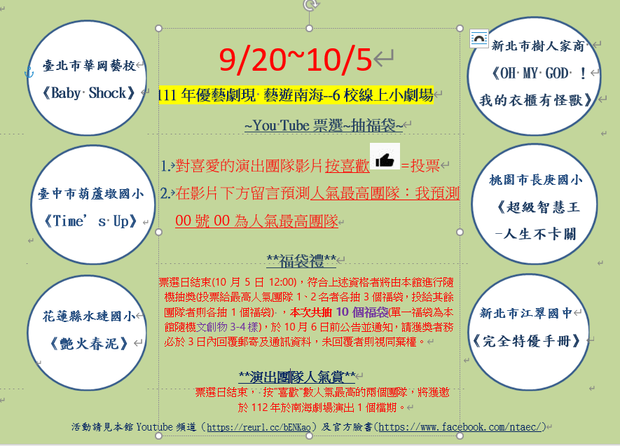 三、旨揭活動同時辦理最佳影片票選及送福袋等活動,活動詳情請逕至該館官方臉書網站https://www.facebook.com/ntaec/查詢。