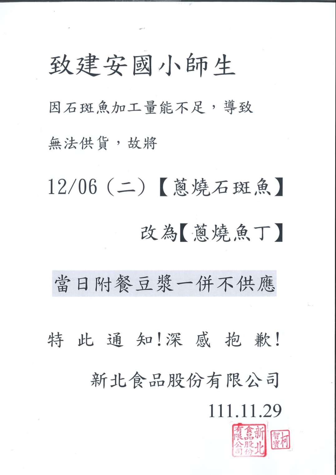 111年12月26日(一)新北食品營養午餐公司改菜通知單