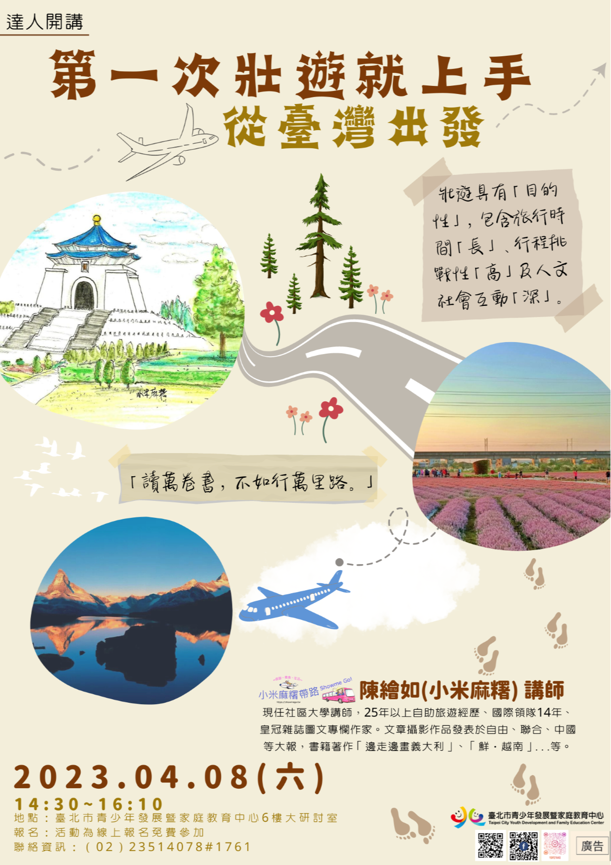 (五)活動地點:臺北市青少年發展暨家庭教育中心6樓大研討 室(臺北市中正區仁愛路1段17號)。 (六)此場為壯遊達人講座,凡申請112年臺北市青少年壯遊臺 灣補助計畫團隊參與講座附照片者得加分。