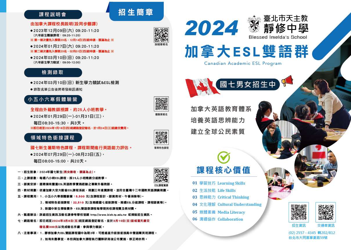 報名方式:請至靜修網頁/國中部入學資訊(www.bish.tp. edu.tw)報名,招生組電話:02-2557-4345分機505。