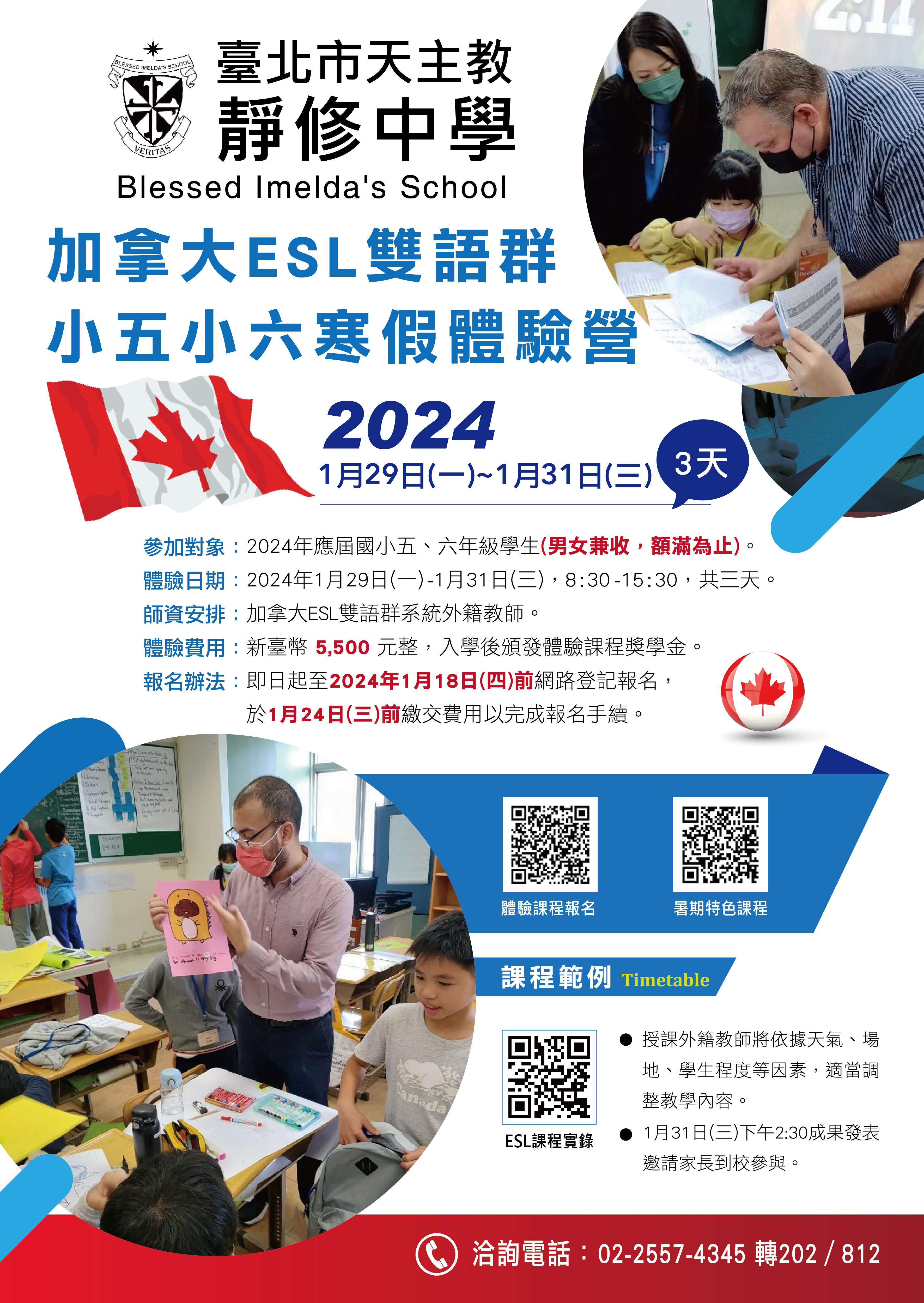 加拿大ESL雙語寒假體驗營時間:113年1月29日(一)至1月 31日(三)