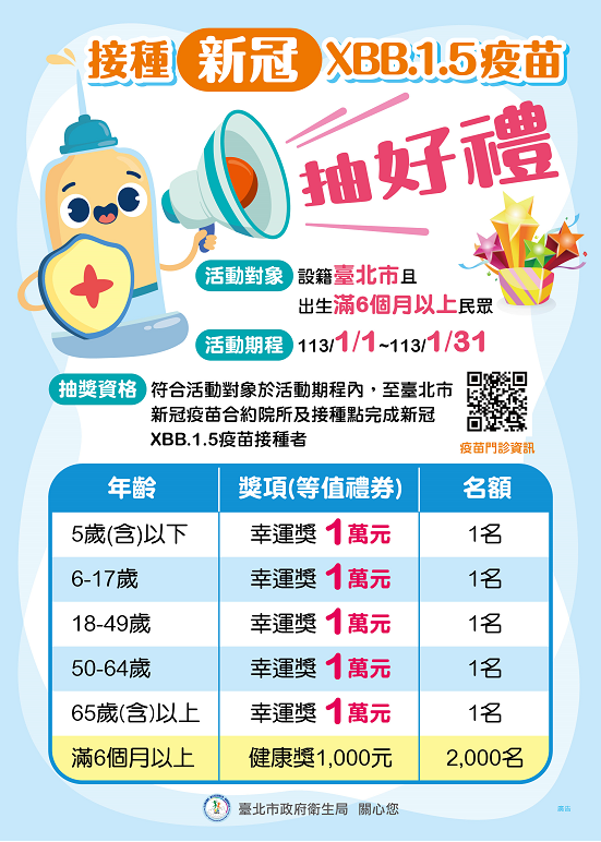 二、凡設籍臺北市市民於113年1月1日至1月31日期間接種新冠XBB.1.5疫苗者,均符合活動抽獎資格。得獎名單將於113年2月29日前公告於本局官網,得獎者須於113年3月1日至4月8日期間,攜帶身分證件至戶籍所在地之健康服務中心或指定地點領獎並完成具領文件簽署。