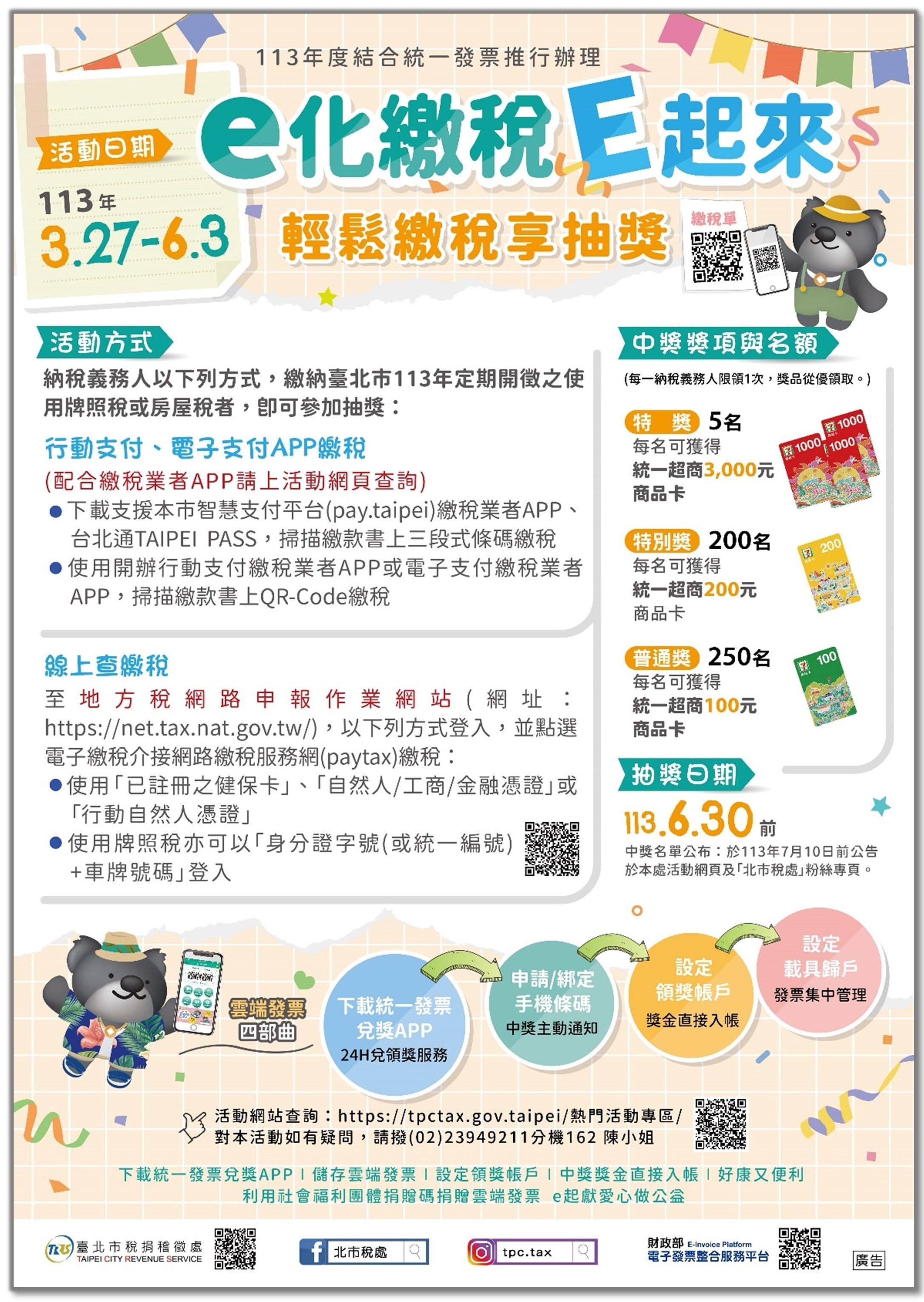 二、自113年3月27日至6月3日止,納稅義務人以線上查繳稅方式或行動支付工具繳納臺北市113年定期開徵之使用牌照稅或房屋稅,即可參加統一超商商品卡禮券抽獎。臺北市稅捐稽徵處大安分處關心您!