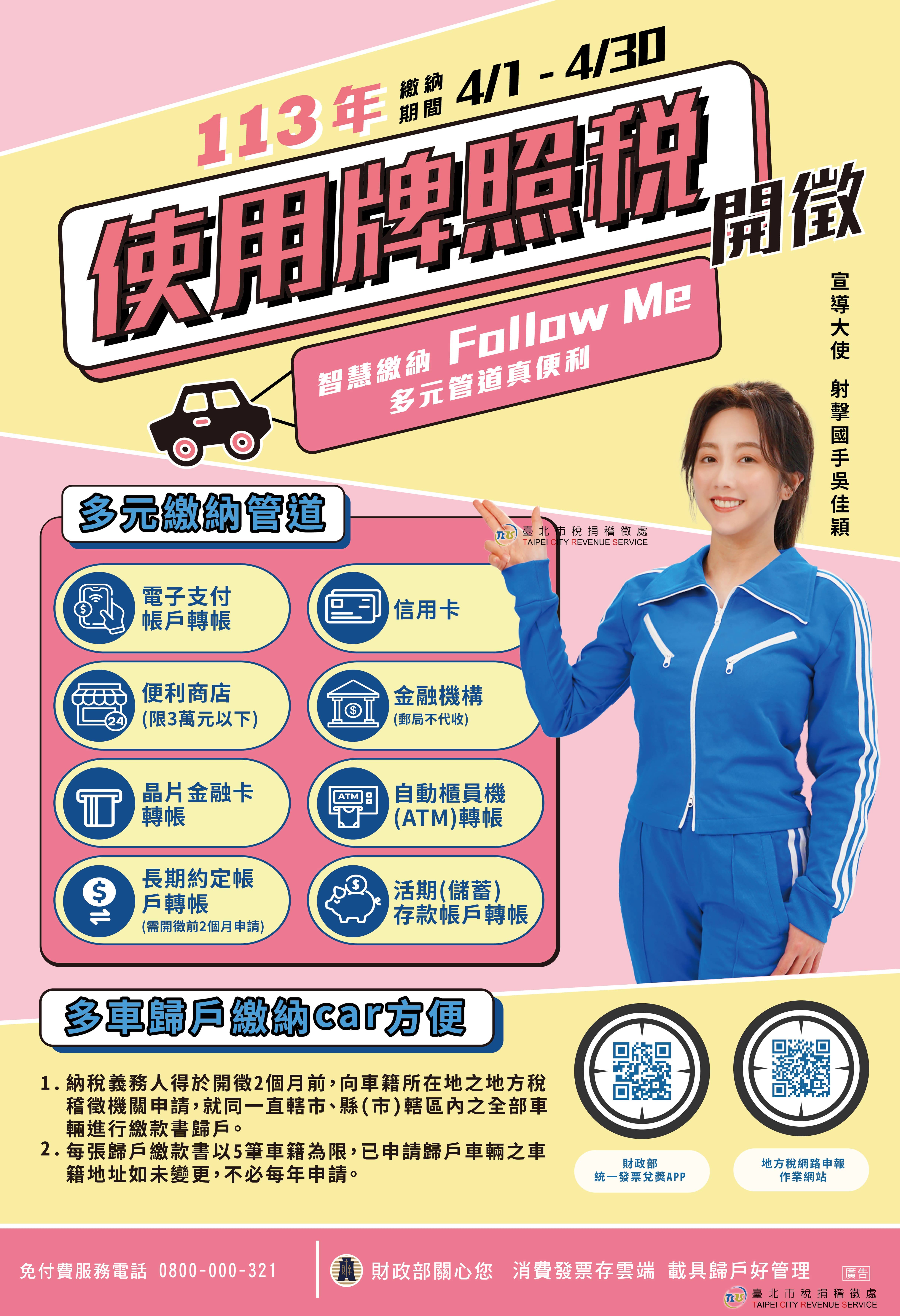 一、113年使用牌照稅開徵囉,繳納期限至 113年4月30日止,歡迎至地方稅網路申報作業網站辦理線 上查繳稅或使用行動支付APP繳稅。臺北市稅捐稽徵處大安分處關心您!
