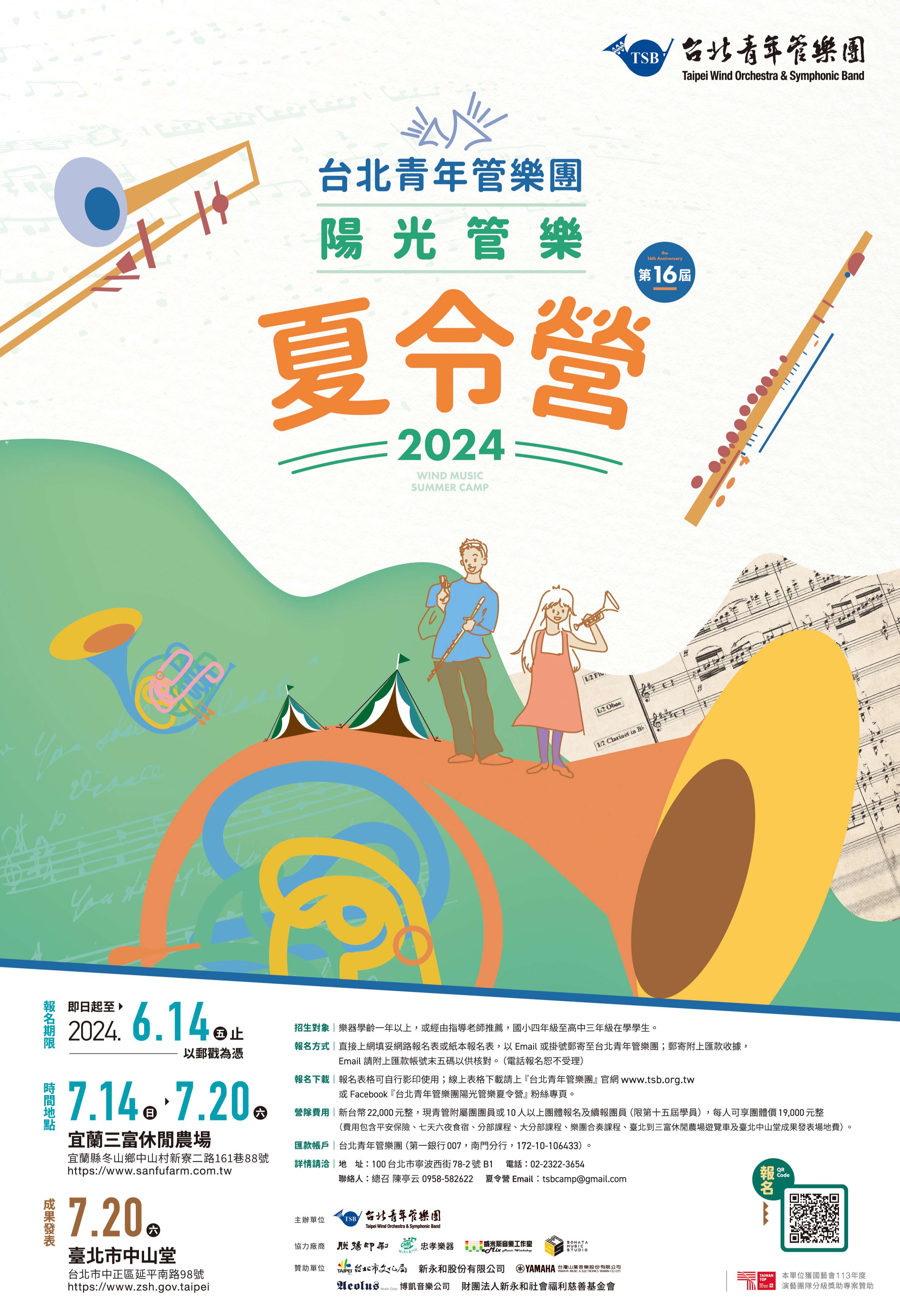 一、台北青管暑假最受歡迎的陽光管樂夏令營,聘請專業師資,規劃豐富充實課程,並規劃於113年7月20日(六)下 午2點30分假臺北市中山堂中正廳舉辦成果發表會,歡迎喜愛管樂演奏學生踴躍報名參加。