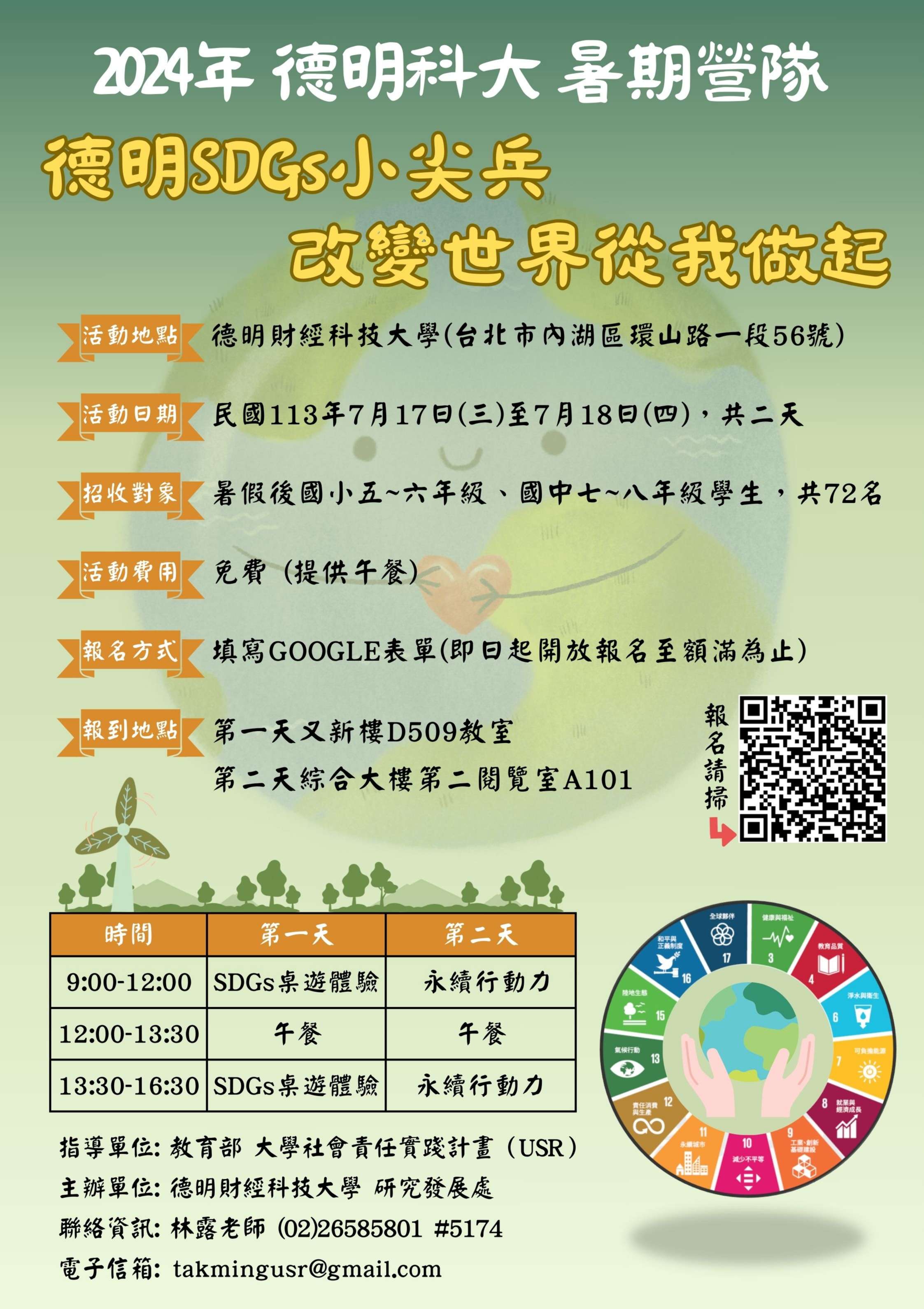 檢附營隊簡章及宣傳海報電子檔各1份,若有問題,請洽活動聯絡人:林露老師,電話:02-26585801轉5174,電子信 箱:takmingusr@gmail.com。