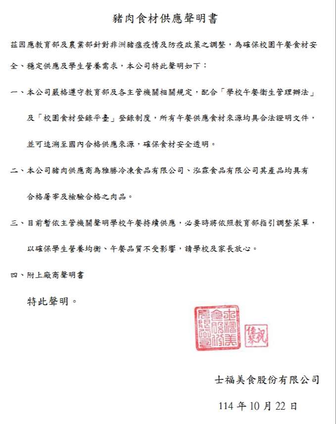 近日台中市查獲非洲豬瘟事件,社會各界對食材安全高度關注。為讓家長安心