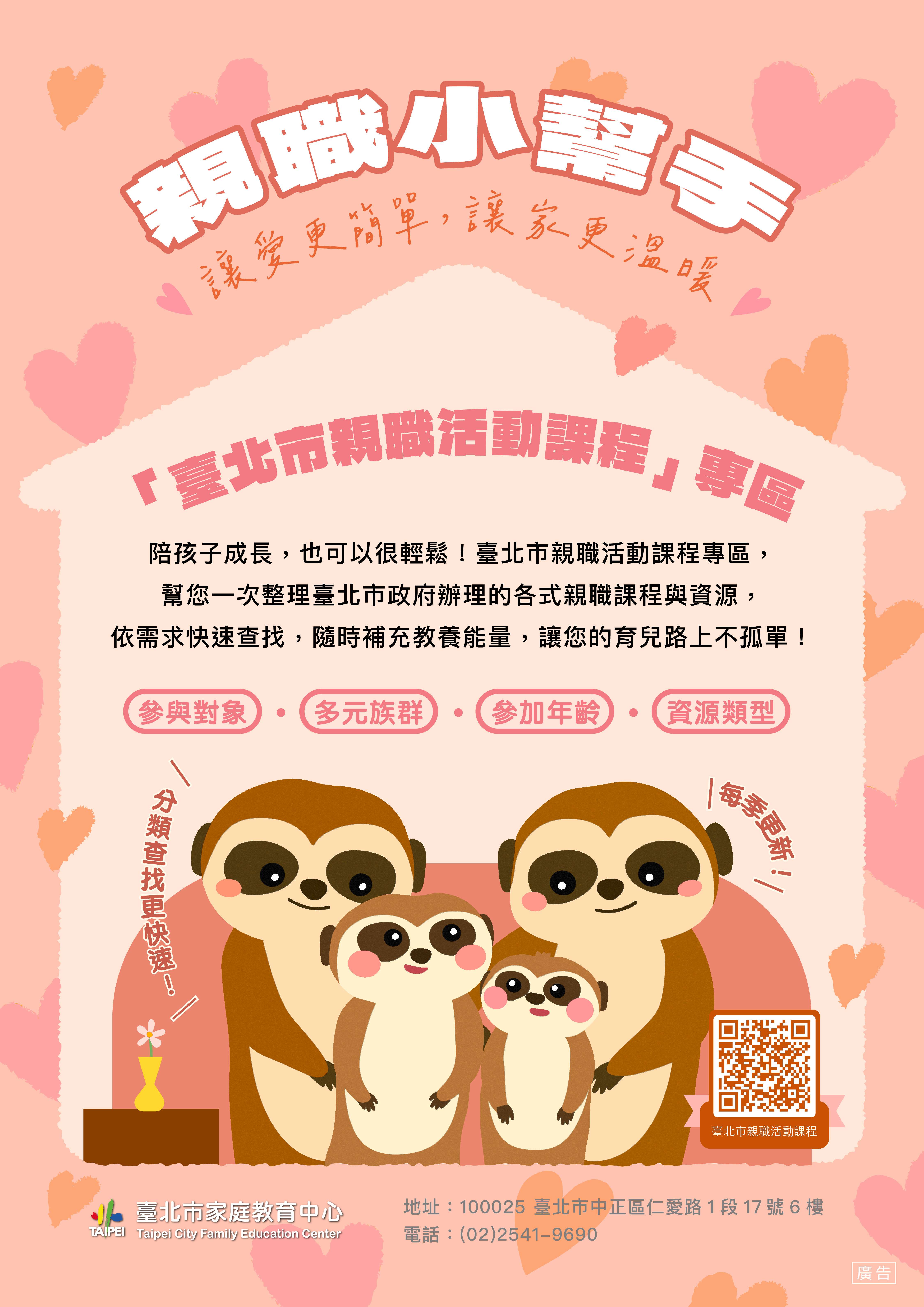 為利家長瞭解本市可用親職教育資源,家庭教育中心於官網設置「親職教育活動課程專區」,彙整本市親職教育相關資源,並將資源分流、分層顯示,俾利查找。